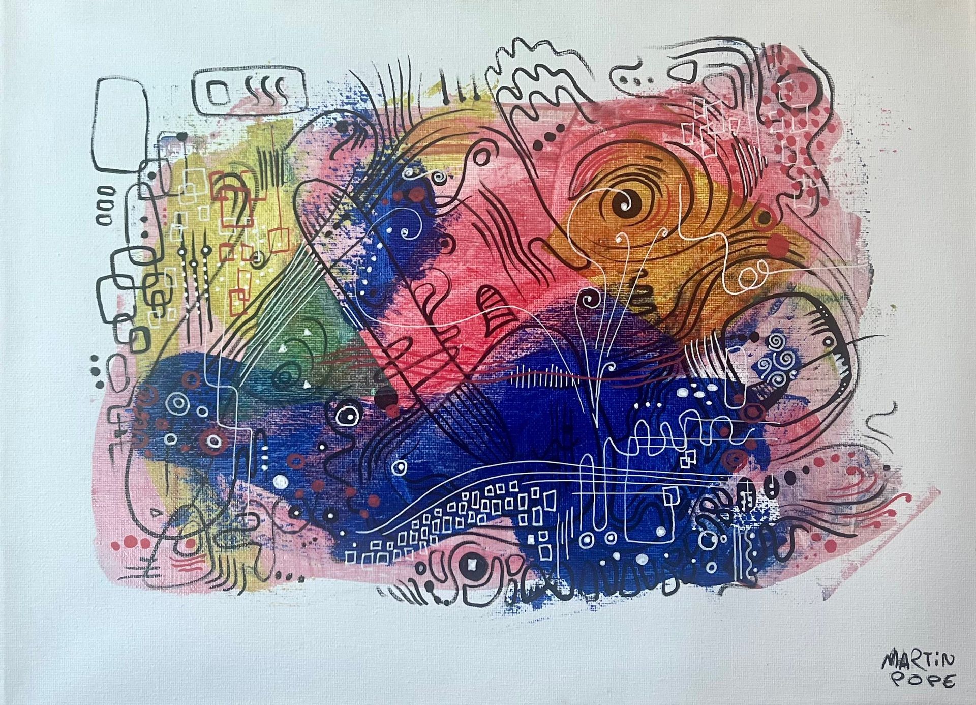 Martin Pope is a multifaceted artist from Columbia, Missouri, whose artistic journey spans theater, music, and painting. A self-taught abstract painter, he found his calling in nonobjective art after a year of reflection during the COVID-19 lockdown.